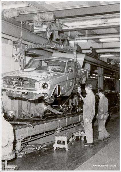 | Most of you know by know that the mustang has been produced in 3 American factories: Dearborn, San Jose and Metuchen. But do you also know that some Mustangs have been produced in the Netherlands ? In Amsterdam to be precise. You don't believe it ? Well here is (the only known) picture of the assembly line: |