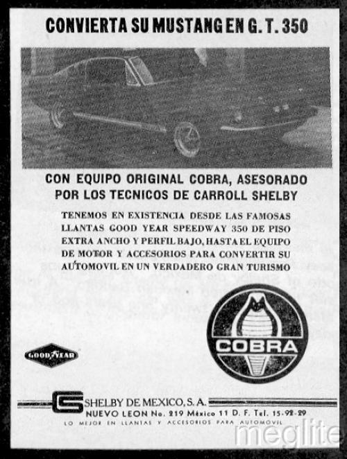 In 1965, Mexican auto parts distributor Eduardo Velazquez bought a Hi-Po 1965 Mustang hardtop and delivered it to Hi-Performance Motors in Los Angeles for conversion to competitive status. Equipped with a race-ready 289ci engine and the complete Shelby suspension, the Mustang became a winner in Mexico . By the end of 1966, Velazquez's team had won ten of the seventeen events they had raced. Ford Motor Company, S.A, the Mexican branch of the corporation, had begun producing Mustang hardtops During 1966, Velazquez became a Shelby parts dealer, and the victories provided great promotion for Shelby aftermarket parts for those Mustangs. In 1967, Velazquez formed a friendship and partnership with Carroll Shelby. Their company Shelby de Mexico, would create modified Mustangs to be marketed through Ford of Mexico dealerships. The Shelby de Mexico models of 1967 and 1968 were powered by 289ci engines and looked nearly identical to their 1967 and 1968 stateside namesakes. Production totaled 169 units in 1967 and 203 units in 1968. The 306 Shelbys produced in 1969 were based on 302hp powered Mustang hardtops, but had fiberglass roofline extensions that created a Fastback look. Their front sheetmetal was near-stock Mustang, but the slightly bulged hoods were fiberglass, their deck lids had spoilers, and the taillights were the 1965 Thunderbird units used by US production 1968 and 1969 Shelbys. Several of the 1969 Shelby de Mexico GT-350s have been brought into the United States during recent years, and two have been featured in Mustang Monthly and other enthusiast magazines. During those years, Shelby de Mexico campaigned Mustang race cars throughout Mexico , including two Shelby-built 1966 and 1967 Group 2 hardtops. Much advice was received from Al Dowd, Phil Remington, and Lew Spencer at Shelby American, and Carrol! Shelby made a point of attending several races in Mexico . The company created two race cars in 1969 and only one in 1970. Only one of those race-specific models is known to survive. Shelby de Mexico, during the 1971 model year, built approximately 200 Shelby Mustang GT-351s (Windsor engines) and 300 Shelby Mavericks powered by 302hp engines.